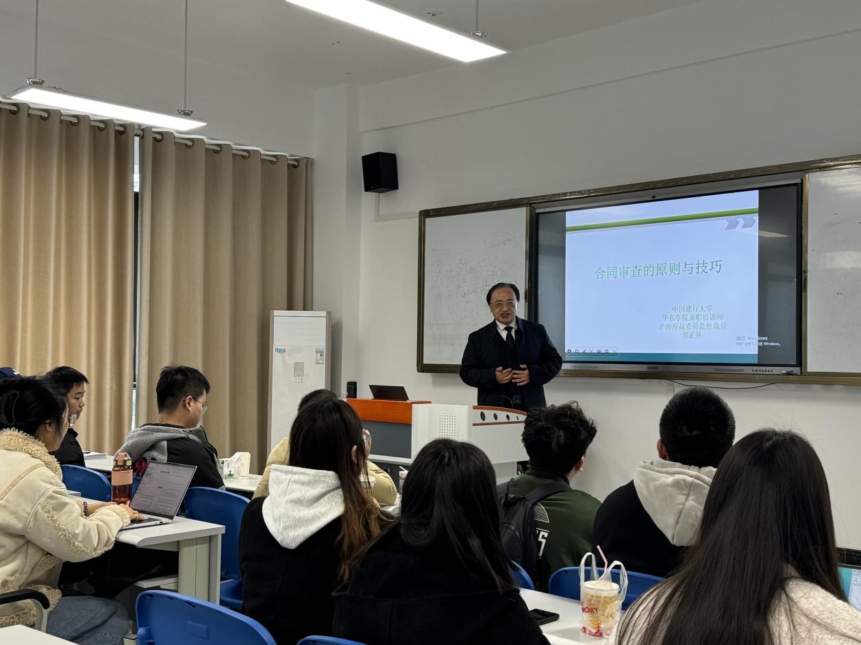 11月28日上午,原泸州仲裁委员会顾问,中国建设银行泸州分行风险管理部、信货审批部、法律事务部经理郭正林应邀来公司,为2024级法律硕士研究生讲授“合同审查的原则与技巧”课程。